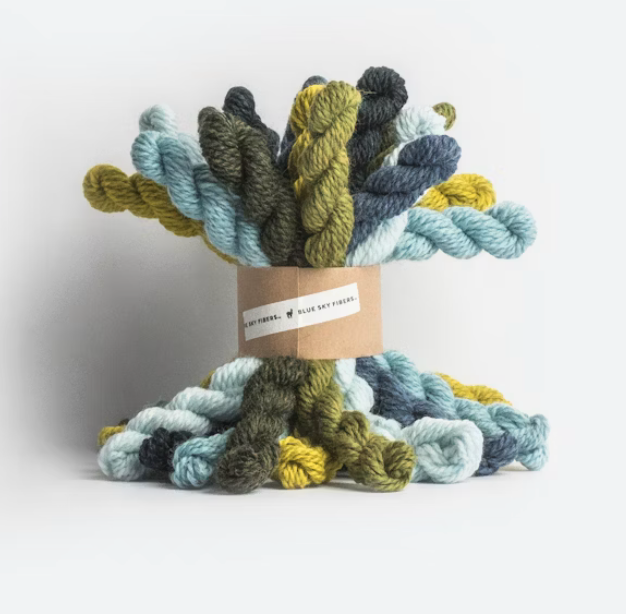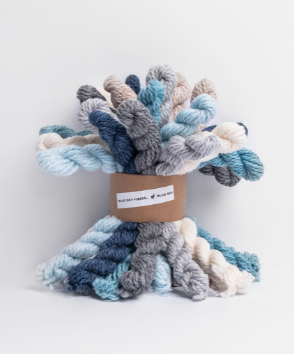 Each bundle comes with 21 mini hanks of Blue Sky Fibers Woolstok Worsted (100% Highland Peruvian Wool, 5g/12 yds each). That’s 3 minis of 7 different shades—basically a color buffet waiting for you to dive in.