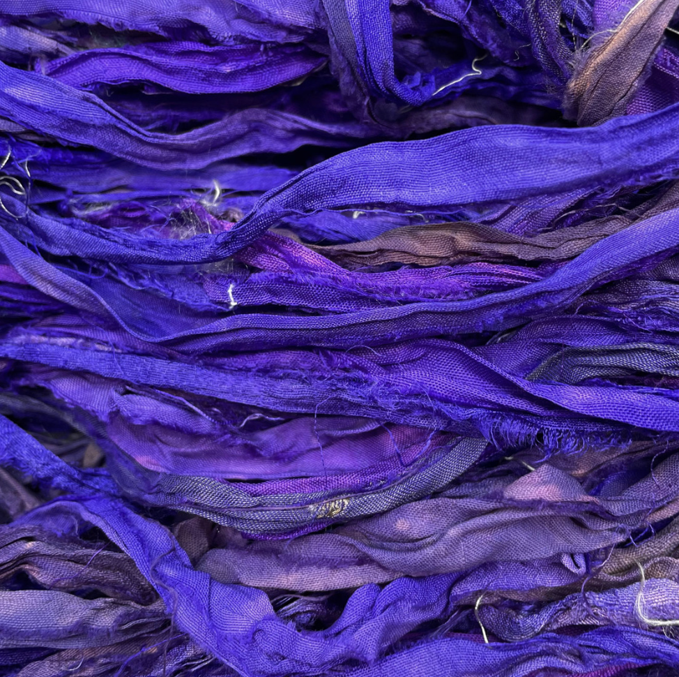 The base for this sari ribbon is made from substantial silk farics and can also be knit as-is to make items that need durability: bags, pillows, etc., and makes a fabulous fringe.
